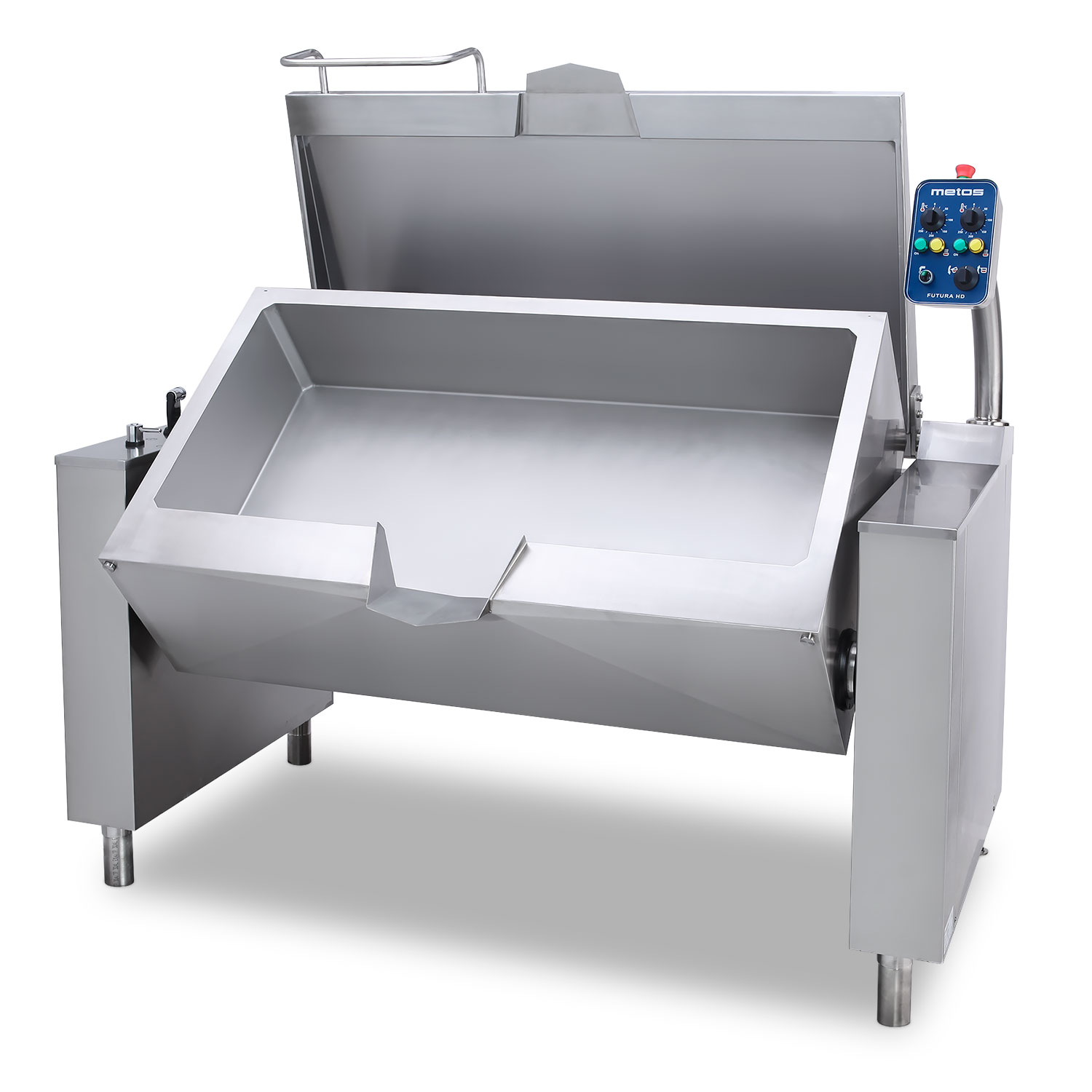 sturdy legs make the pan stable; and motorised tilting, easy cleaning