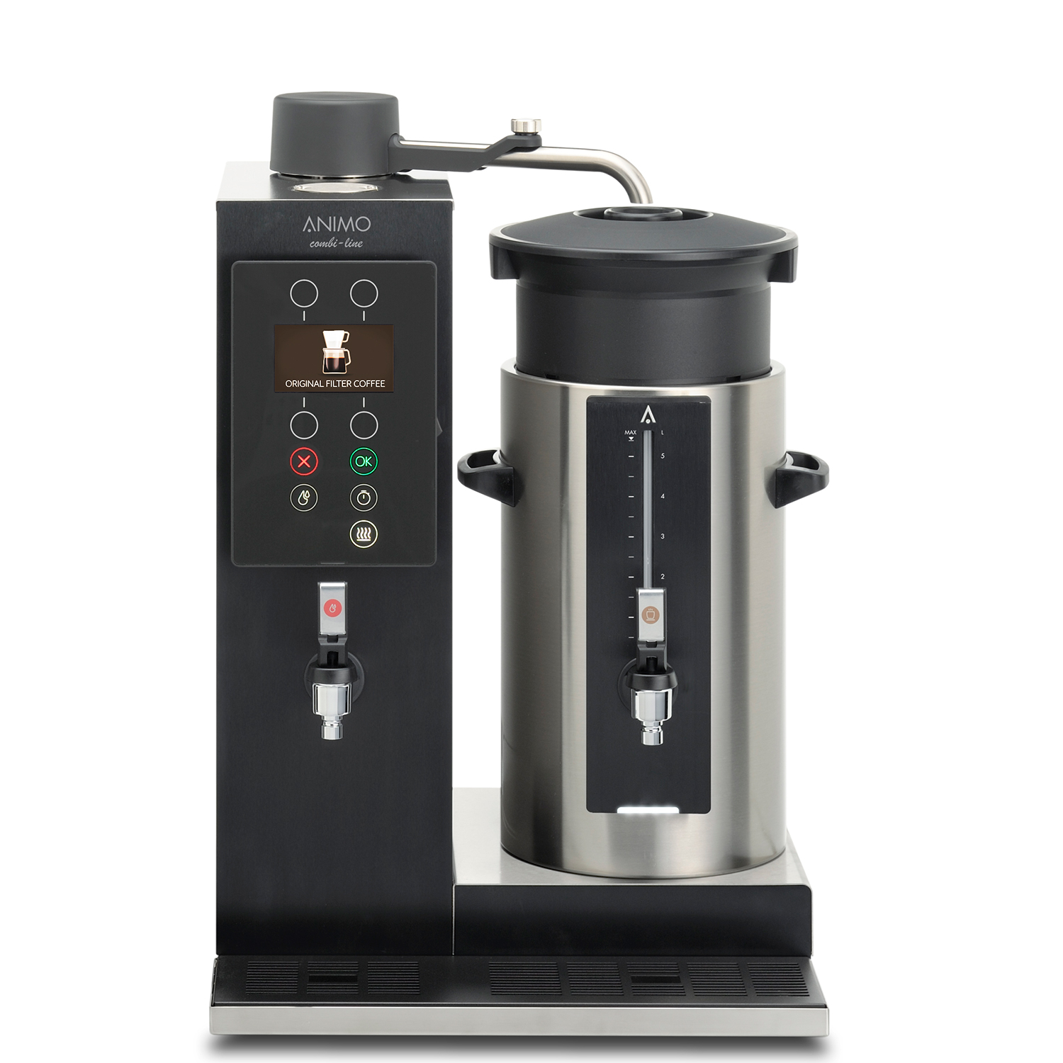 – the amount of brewed filtered coffee can be selected in litres or