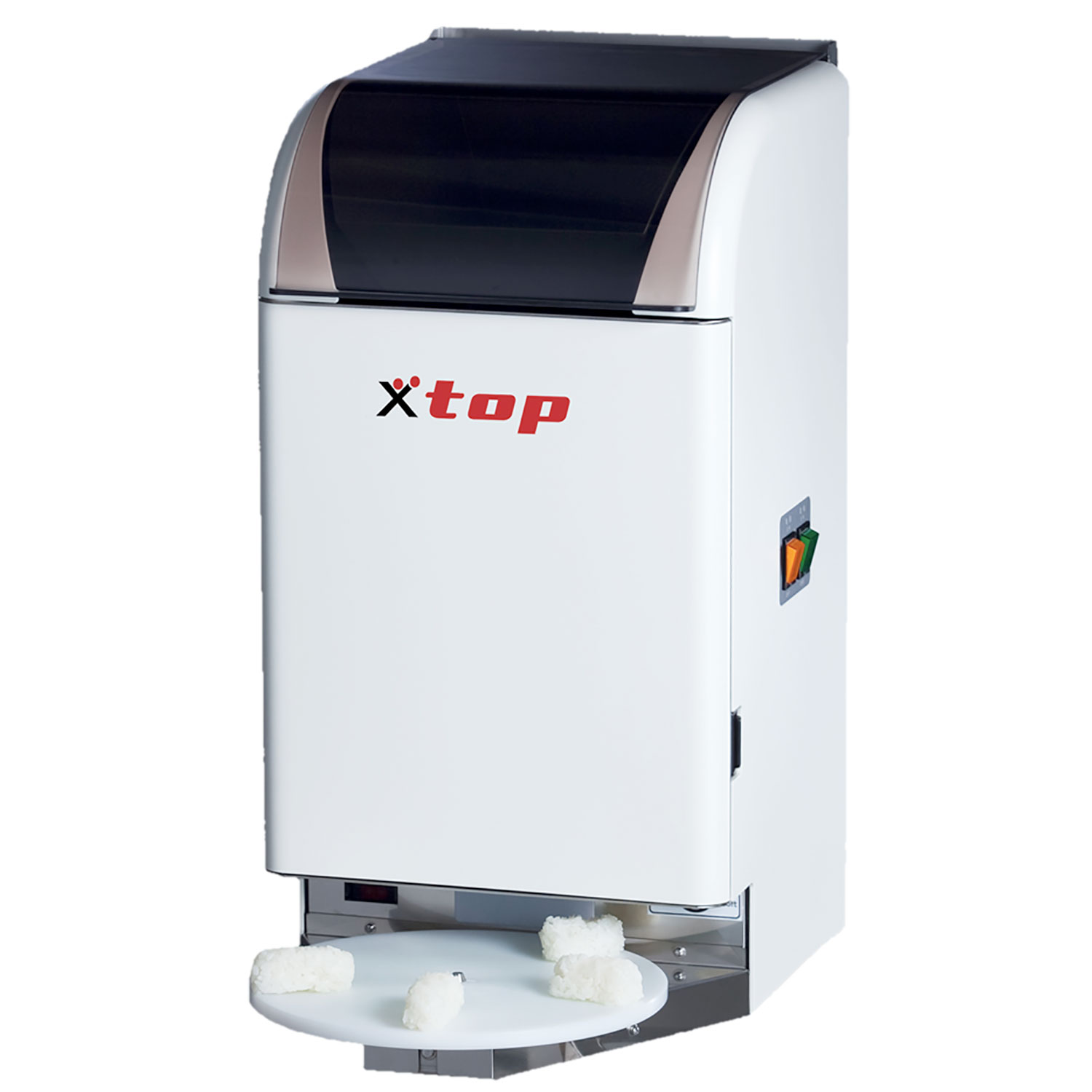 – automatically shapes the rice pieces and portions them onto the dial