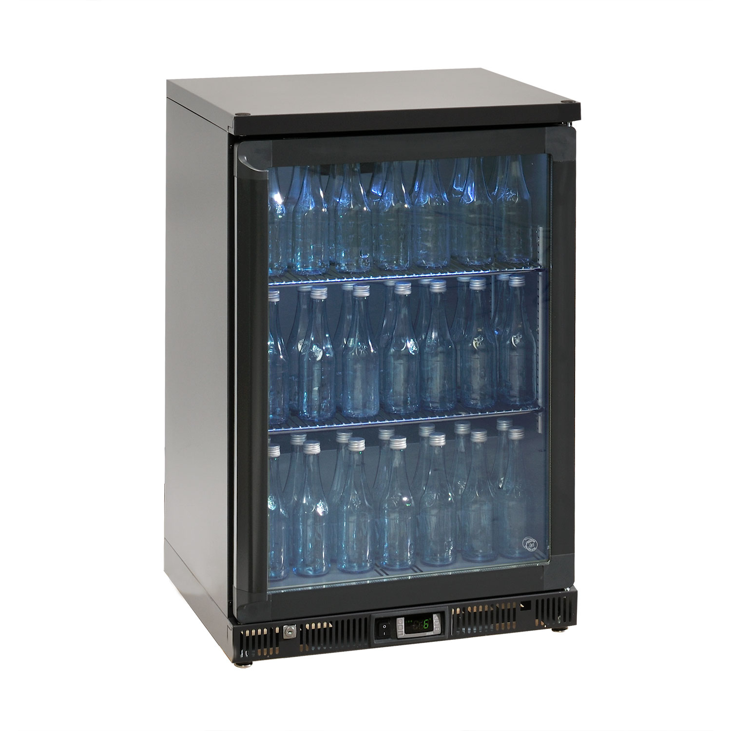 workspace. The glass door cooler has two adjustable flat shelves. LED