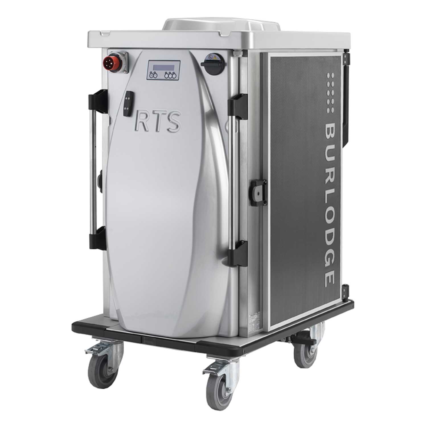 Serving trolley for portioned meals on trays in cook-serve operations.